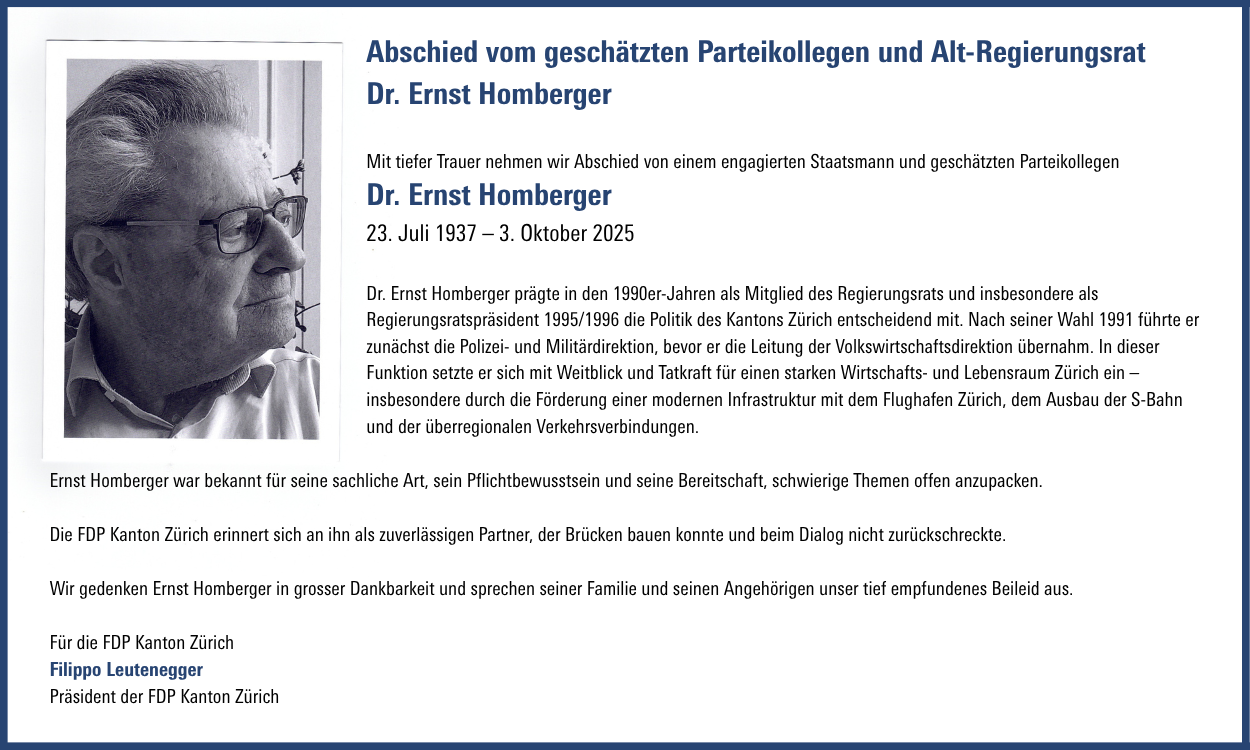 Abschied vom geschätzten Parteikollegen und Alt-Regierungsrat Dr. Ernst Homberger